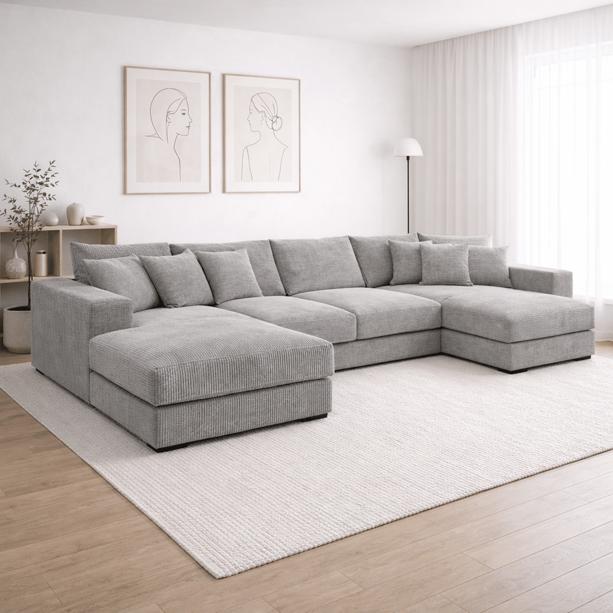 Eden U išsiskiria dideliais gabaritais, todėl tai ne „kompaktinė“ sofa, o pilnavertė poilsio zona. U forma leidžia patogiai įsitaisyti keliems žmonėms vienu metu, be jausmo, kad trūksta vietos. Tokį formatą ypač įvertinsi, jei namuose dažnai būna svečių, jei šeima mėgsta būti vienoje erdvėje, arba jei tiesiog nori sofos, ant kurios realiai galima atsipalaiduoti.